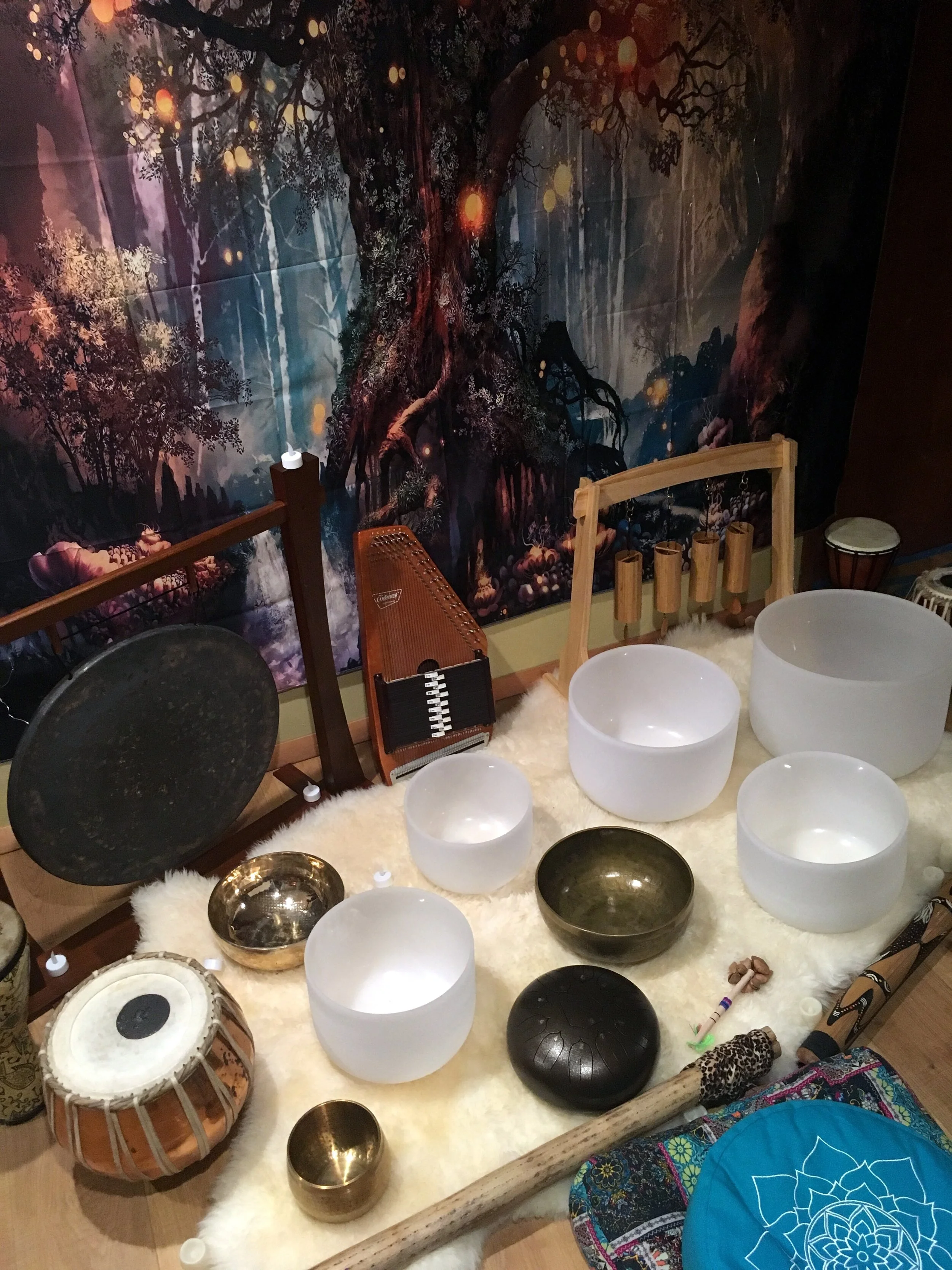 You will then be guided by the various sound frequencies of vibrational instruments into the cells and surrounding fields of the participants' bodies; easing tension and dissonance, thereby creating a sensation of inner harmony, resonance, and connection.