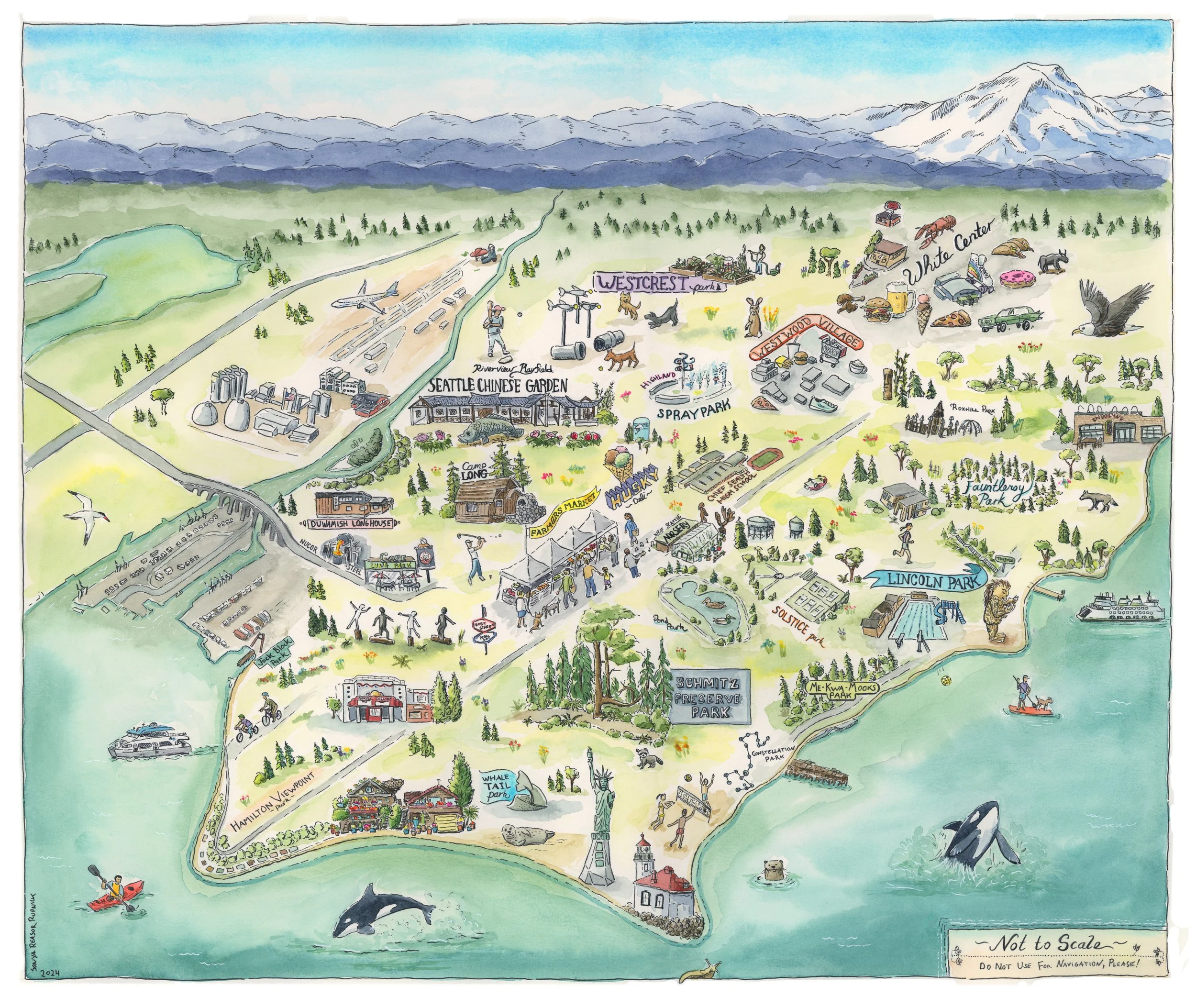 Come to meet our local treasure Sonya Reasor, beloved artist, who has created a map of West Seattle with all of the landmarks we love!