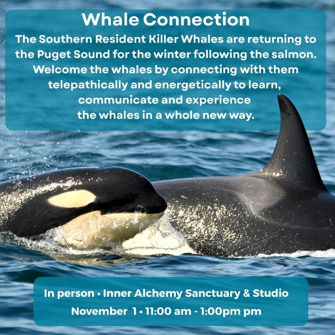 Spend this Saturday morning welcoming the Southern Resident Killer Whales back to the Puget Sound. These iconic Seattle residents will spend the winter traveling up and down the Sound following the salmon runs. You will be warm and cozy at Inner Alchemy Sanctuary and Studio playfully learning to connect with the whales. It is a guided communication experience that has some long pauses for communication and deepening.